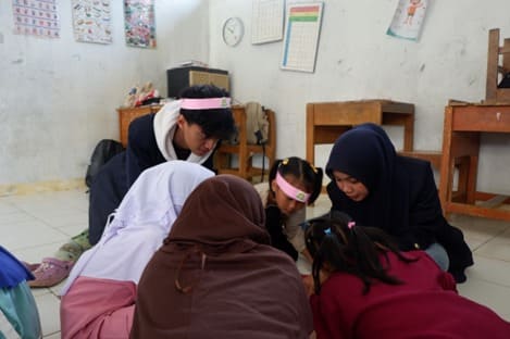 Saya bersama beberapa teman dari SOSMA mencoba membuat suasana belajar lebih hidup dengan permainan sederhana. Kami membagi mereka ke dalam kelompok kecil, lalu memberi hiasan kertas di kepala sebagai penanda. Wajah polos mereka berseri-seri, tawa renyah terdengar memenuhi ruangan, membuat kelas sederhana itu terasa hangat dan penuh energi. Awalnya saya sempat ragu, “Apakah mereka akan mau mendengarkan? Apakah saya bisa mengajar dengan baik?” Namun, keraguan itu sirna ketika melihat tatapan serius mereka, seakan menunggu pengetahuan baru yang akan kami bagikan. Kami bercerita tentang fakta-fakta unik negara, bermain kuis sederhana, hingga melukis bersama.